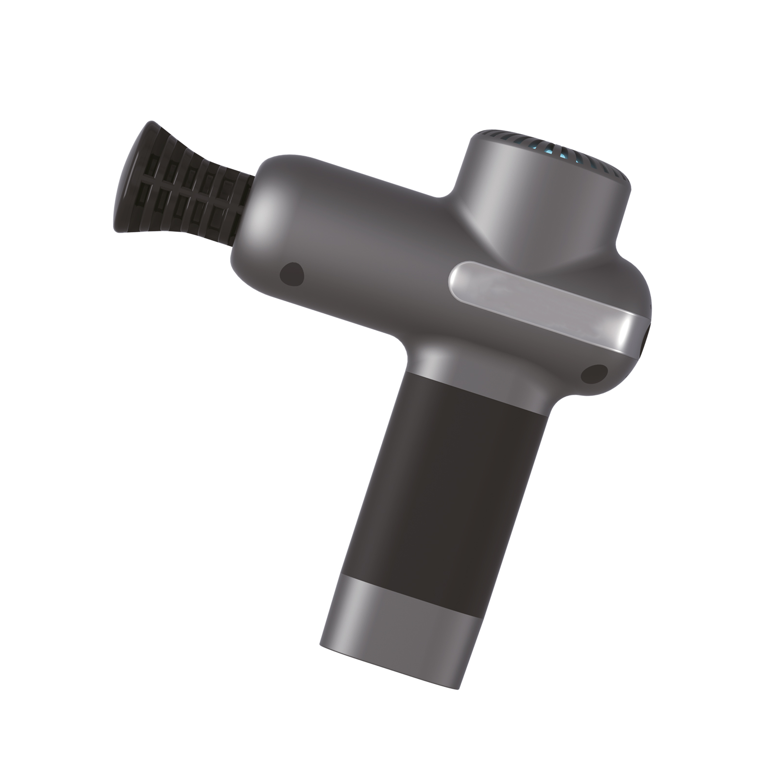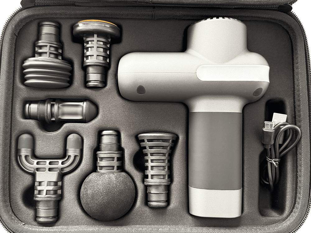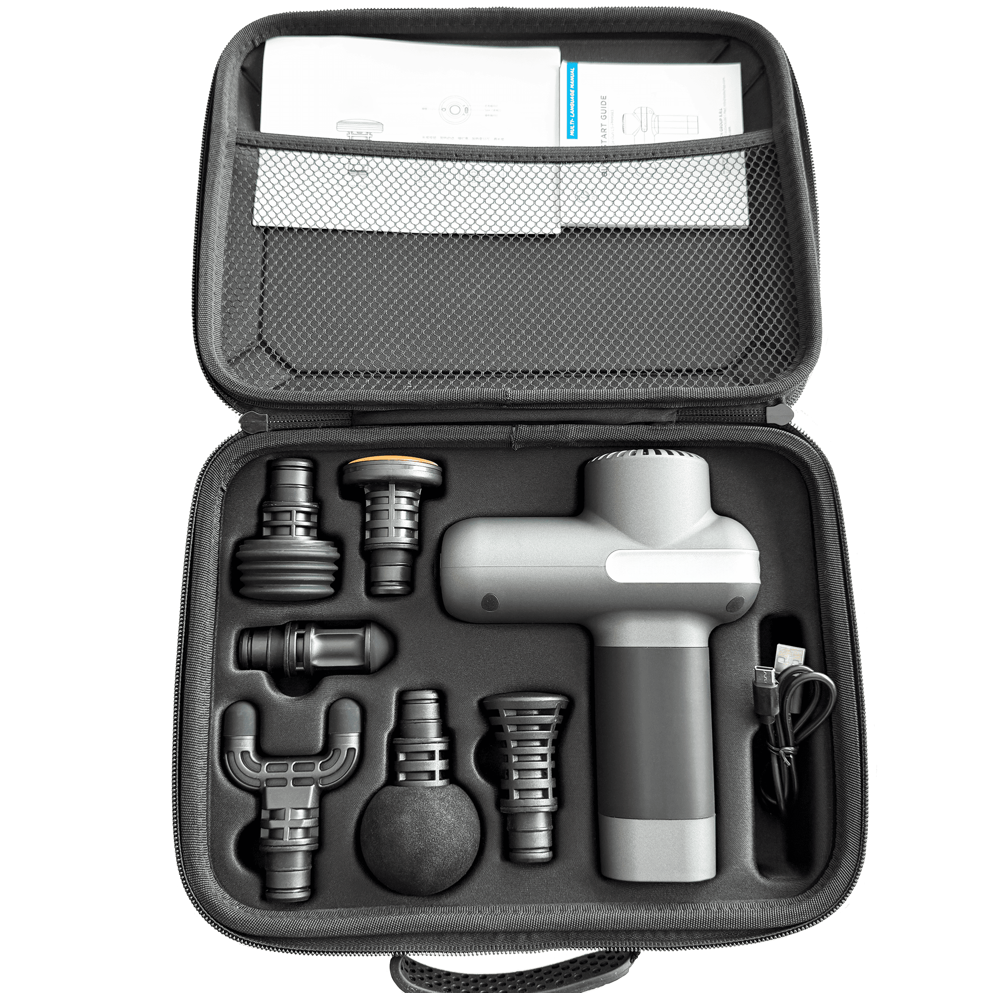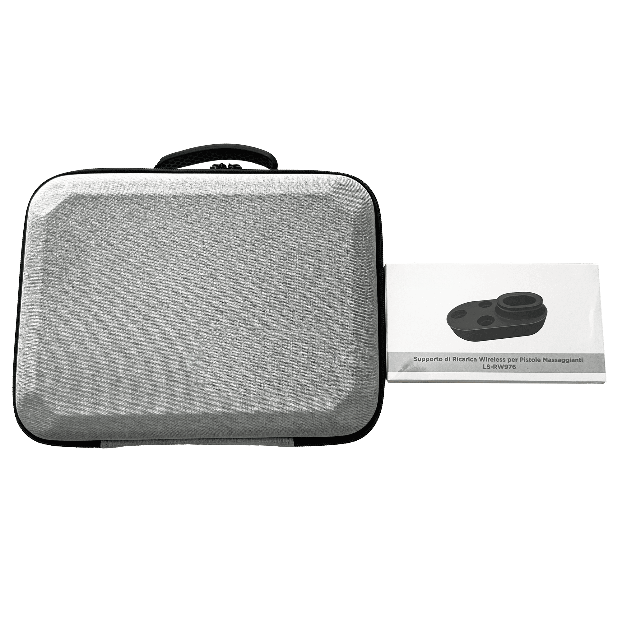 Pistola massaggiante ad alta intensità, con base di ricarica wireless inclusa. Adatta al recupero muscolare e come terapia ai dolori muscolari. Dotato di 6 testine